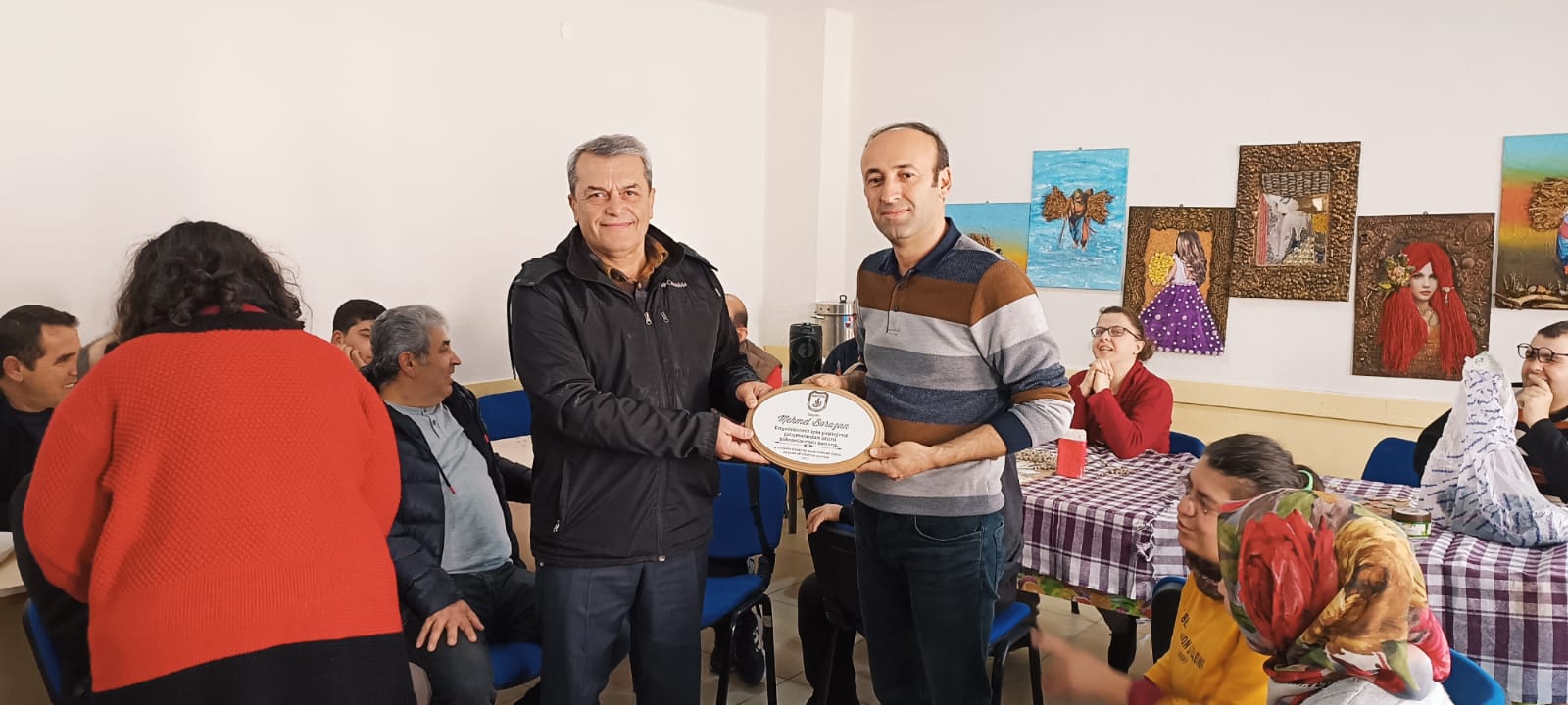 Engelli öğrencilere hizmetlerinden dolayı, Halk Eğitim Müdürü Mehmet Borazan ve, kurs öğretmeni, Derya Doğan'a plaket verildi.